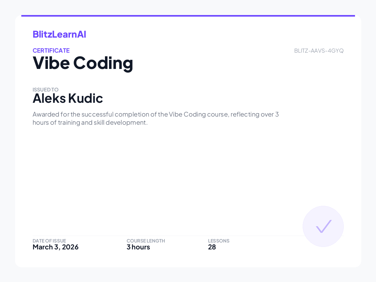 Awarded for the successful completion of the Vibe Coding course, reflecting over 3 hours of training and skill development.